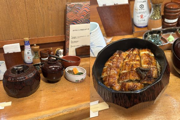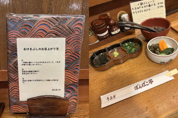 一杯目は温かいうちにそのままよそってうなぎの味を楽しみ、二杯目は薬味を乗せて三杯目は出汁をかけて食べるとのこと