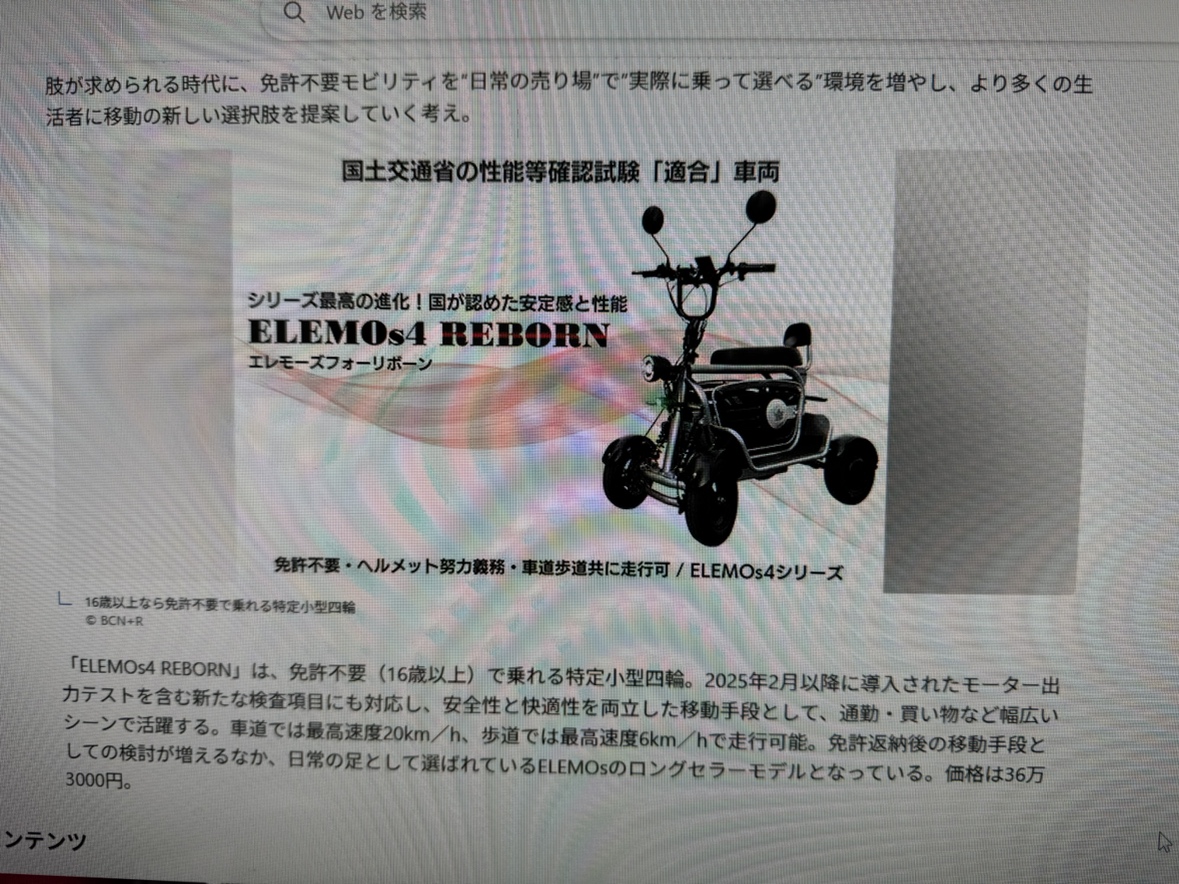 2026.03.16 「マキシムのまいにち」~スタッフの日常をお届けします~ 免許返納後、買い物に行けなくなったり一人で散歩ができなくなったら ELEMOs4 REBORN免許不要(16才以上)で乗れる特定小型4輪を発見しました。 363,000円。歩道も6K走行が可能、ちまたでは、2輪の電動キックスケータやセグウェイなどがありますが、バランス取りが大変、だんだん便利なものが出てきますね。 関本